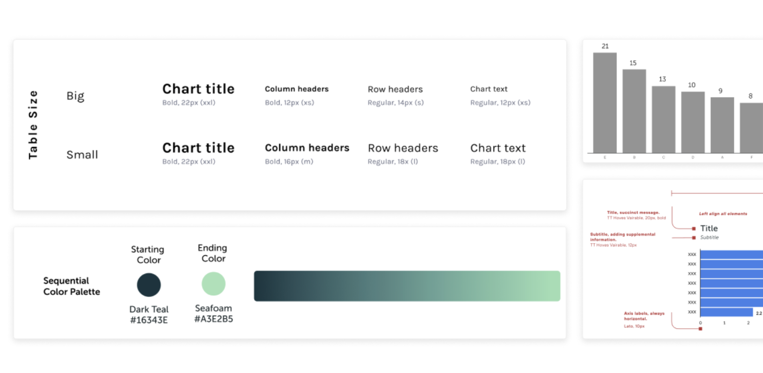 Data viz style guides often include explaining the what (e.g., types of charts), the why (e.g., reasons for using specific colors), and the how (e.g., tools or templates). Data visualization style guides can also fit within an organization’s larger design system and include how other guidelines, like brand standards or editorial guidelines, apply to data visualization. For example, they might specify how elements like a logo, brand colors, and language tone specifically apply to charts, tables, and diagrams.